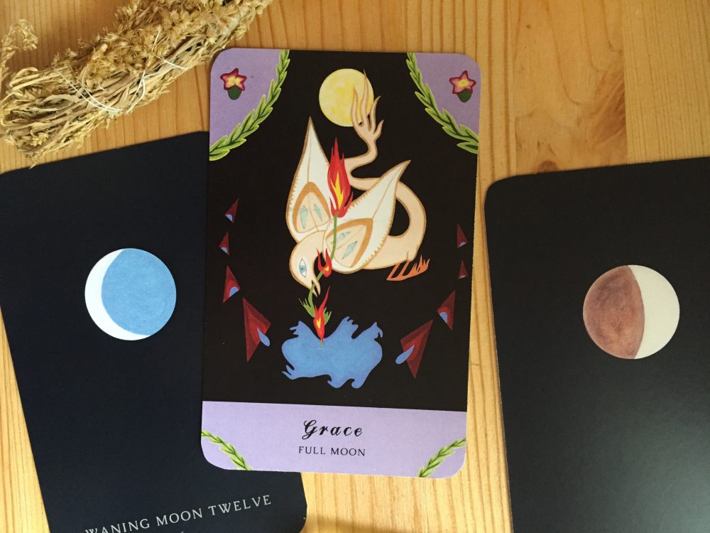 June’s gathering was hosted by Bridgette Buckley and featured the work of Rebecca Schoenecker. Rebecca is an artist, teacher and musician. She received her MFA from the School of the Art Institute in 2008 and spent the years following working at colleges, touring with her band, reading tarot, and creating art. In 2011, she self-published her first tarot deck, the Laughing Eye Weeping Eye Tarot. It was more successful than she anticipated, as were her tarot readings, which some expressed were life-altering. This encouraged her to continue and in 2013 she left her job so she could pursue these passions full-time. Fueled by a captivation of all things metaphysical, she explores the esoteric through meditation, channeling, spirit work, various healing modalities, art, music and tarot card readings. Rebecca describes her practice of divination as seeking answers where there are none.